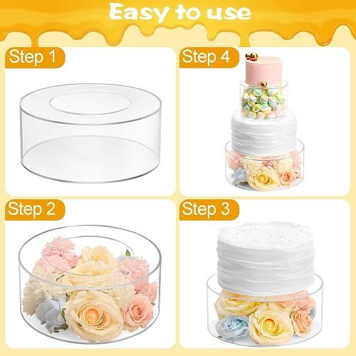 - Acrylic Decorating Cake Spacers: Made of solid acrylic. Fully transparent design makes items visible from all sides. Elegant appearance and can be stacked together.