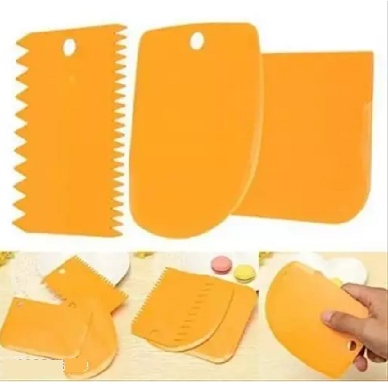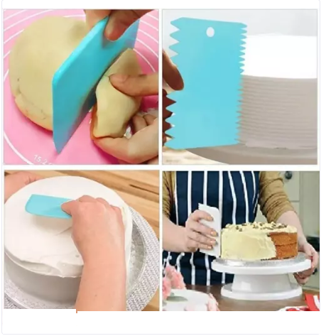 Cake decorating scrapper ideal tool for decorative fondant icing gives a smoother edge and great finishing. • Made of food-grade plastic, FDA approved, non-toxic, smooth, highly durable, easy to handle & use. • 3 pcs set baking products tools for topper designs. MULTICOLOR scrapper.